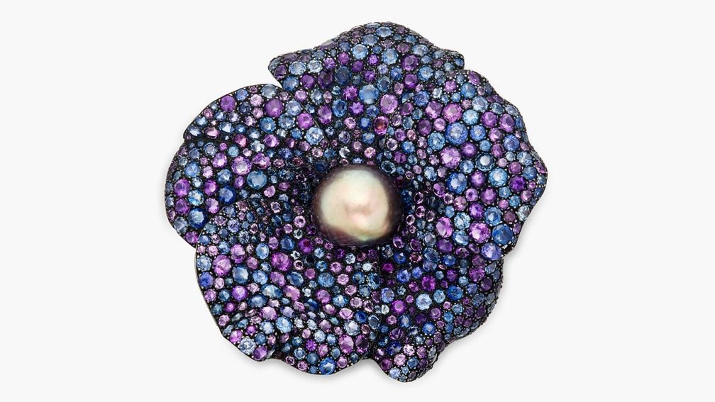 В центре этой броши Wild rose от JAR – серая природная жемчужина среди лепестков из аметистов и сапфиров. Ее цена составила $ 609 600.