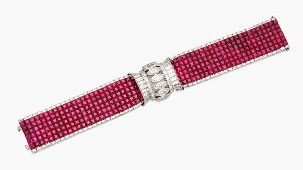 Дом Cartier изготовил этот браслет с рубинами и бриллиантами в невидимой оправе в 1930-х годах. На аукционе Sotheby’s он был продан за $ 558 800, что лишь немного превысило его предварительную максимальную оценку в $ 500 000.