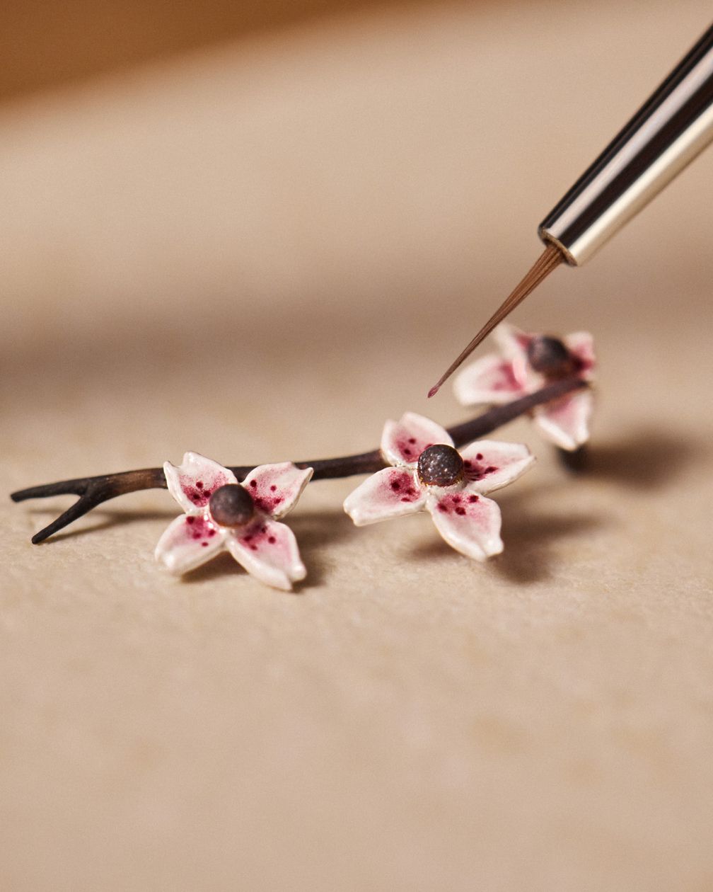 Нежно колышущиеся цветы сакуры, выполненные из желтого золота и эмали, завершают это волшебство.