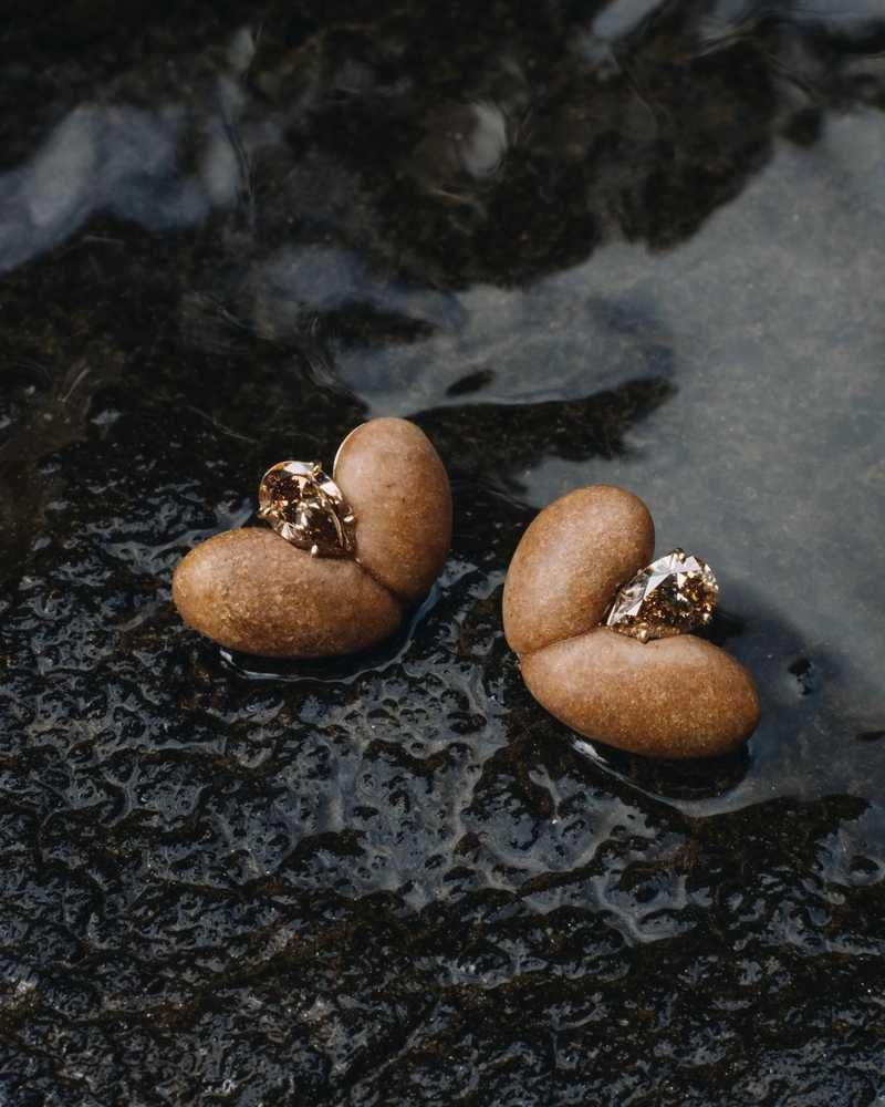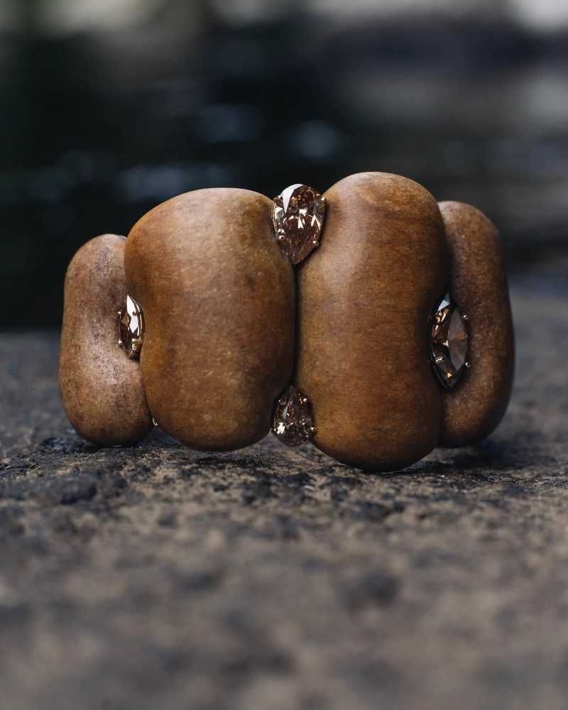 Он взял коричневую гальку из бразильского парка, где когда-то в русле реки были найдены алмазы, и выложил из нее манжеты, кольца и сережки, а между ними вставил подходящие по цвету коричневые бриллианты, словно точки света, вклинившиеся в гору валунов.