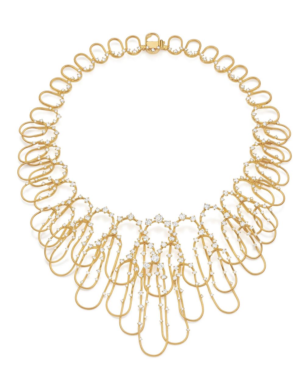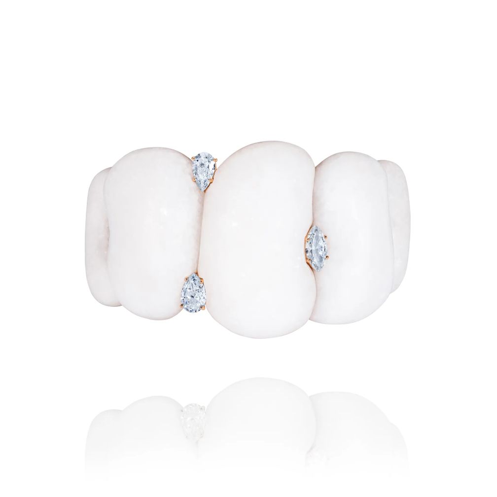В похожем стиле он использовал сферические камни белого мрамора, перемежающиеся белыми бриллиантами, в ювелирных изделиях, которые, несмотря на свой масштаб, сдержанны в своей белизне и естественности.