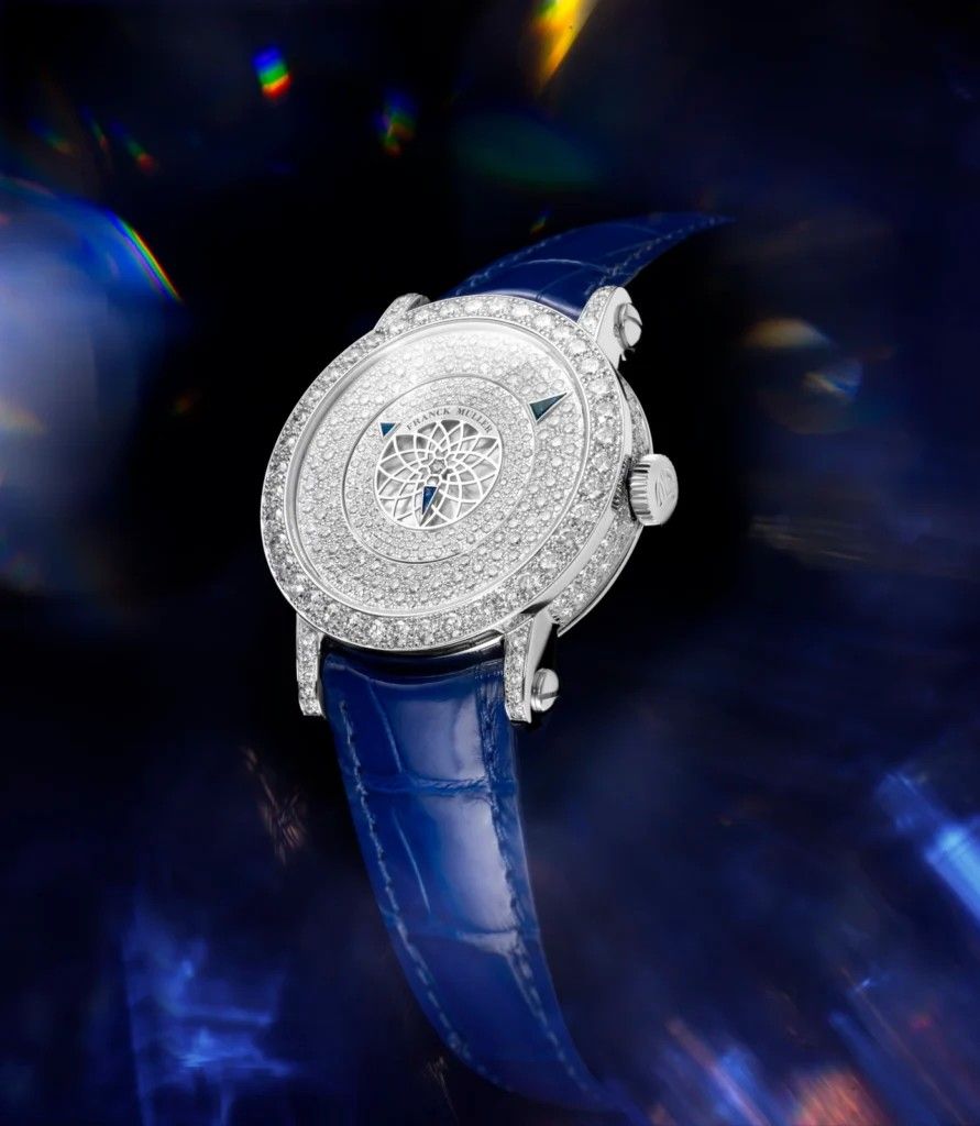 Центральный элемент из платины украшен одним бриллиантом, вставленным в геометрический узор, напоминающий рисунок спирографа. Такой выбор дизайна служит не только эстетическим целям. Он подчеркивает вращательное движение, определяющее функцию часов, и перекликается с инкрустированным бриллиантами корпусом, создавая взаимодействие движения и света, которое меняется в зависимости от угла обзора. Сам индикатор секунд представляет собой бриллиант треугольной огранки или драгоценный камень, описывающий непрерывную линию по всему циферблату, что отличает его от традиционных секундных стрелок, которые движутся скачками.