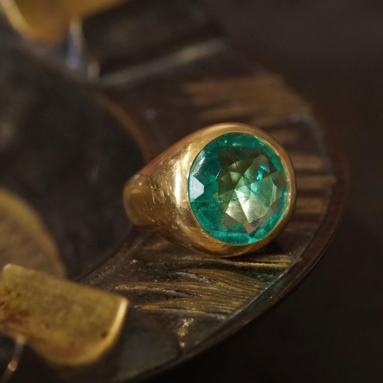 Кольцо из 20-каратного золота в цыганской оправе с круглым колумбийским изумрудом весом 7,48 карата из шахты Чивор (Nicole Fournier/Jogani):