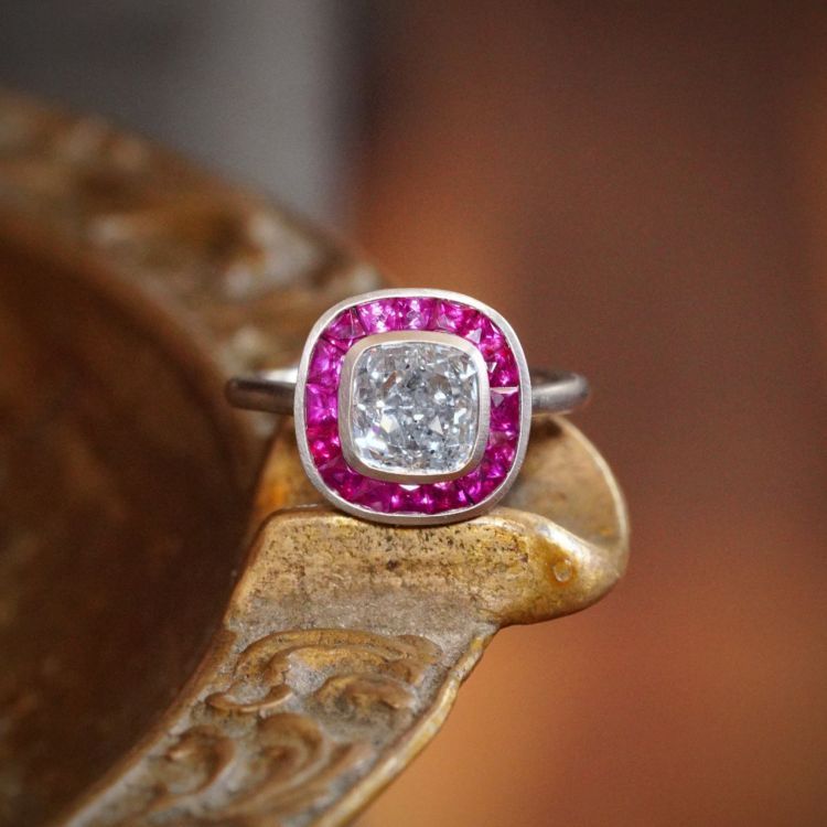 Платиновое кольцо в стиле ар-деко с голубым бриллиантом весом 2 карата и бирманскими рубинами (Nicole Fournier/Jogani):