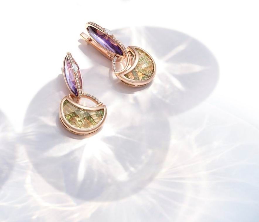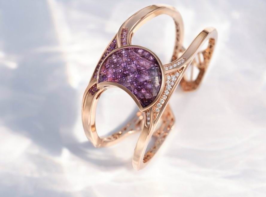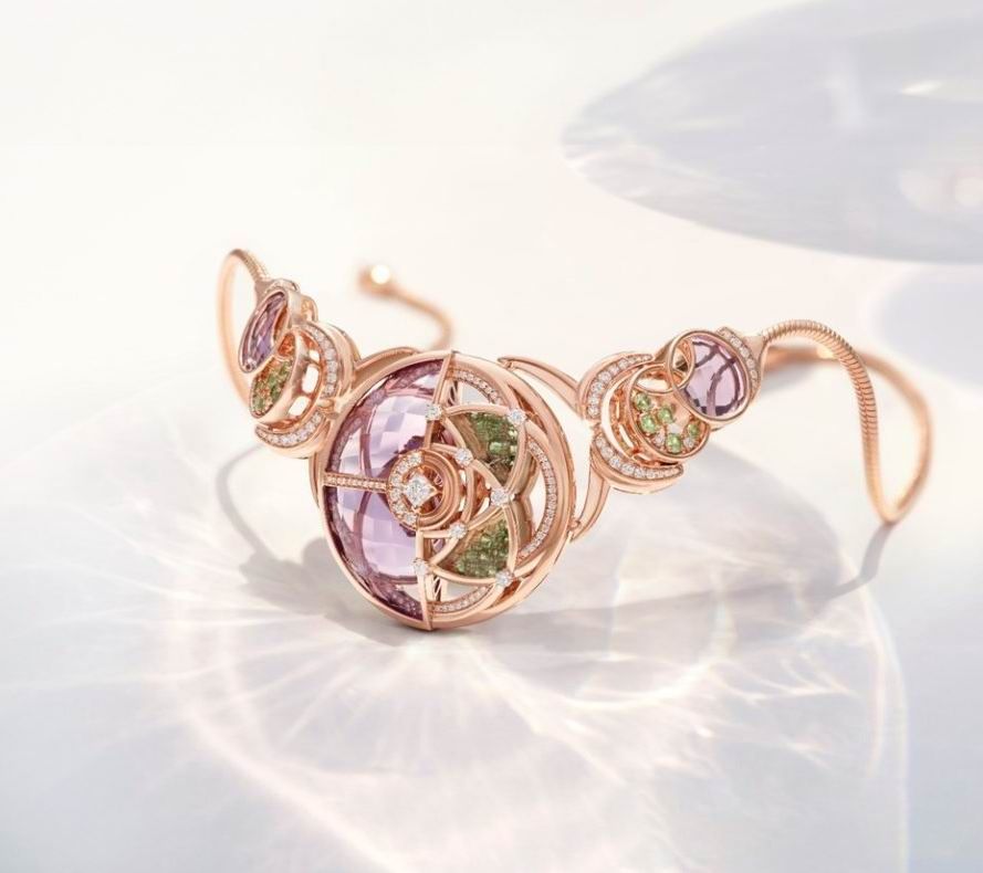 В новой интерпретации Aeterna уникальные огранки зеленых и фиолетовых аметистов вписаны в мириады узоров из розового золота. Эти тщательно проработанные элементы становятся символами энергии, баланса и трансцендентности. В то время как фиолетовый аметист продолжает поддерживать женскую сущность, зеленый аметист пробуждает нежность внутри.