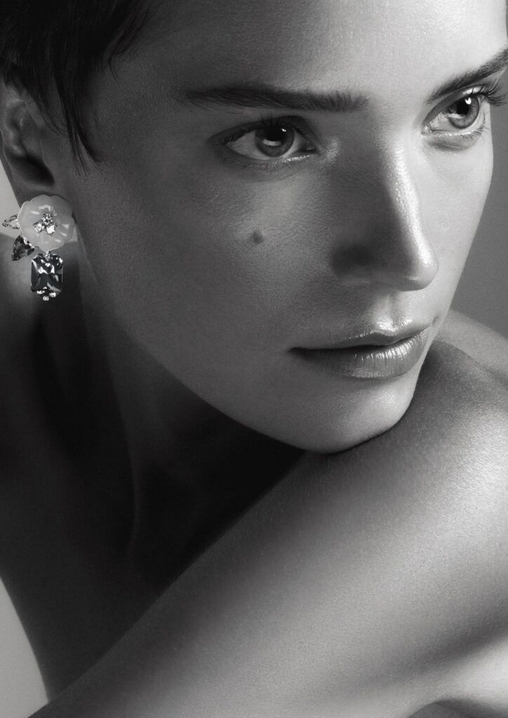 В центре композиции — небольшой цветок из агата молочных тонов, подчеркнутый центральным бриллиантом классической огранки и небольшими декоративными листьями. Этот мотив расположен в сердце полужесткого чокера и дополнен крупными топазами и празиолитами нежных зеленых и бледно-голубых оттенков. В коллекции также представлены серьги-подвески двух размеров и кольцо с тремя крупными камнями. Изысканные формы и сбалансированные пропорции украшений продолжают традиции бренда.