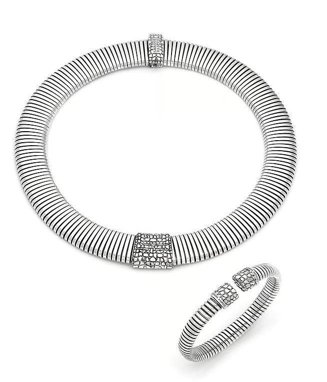 - Tubogas Croco, вдохновленная неподвластным времени дизайном браслетов, линию дополнили браслеты и ожерелья со вставками с текстурой кожи крокодила. В коллекцию входят колье, три жестких браслета и один спиральный браслет – каждое украшение доступно в серебряном и позолоченном вариантах.