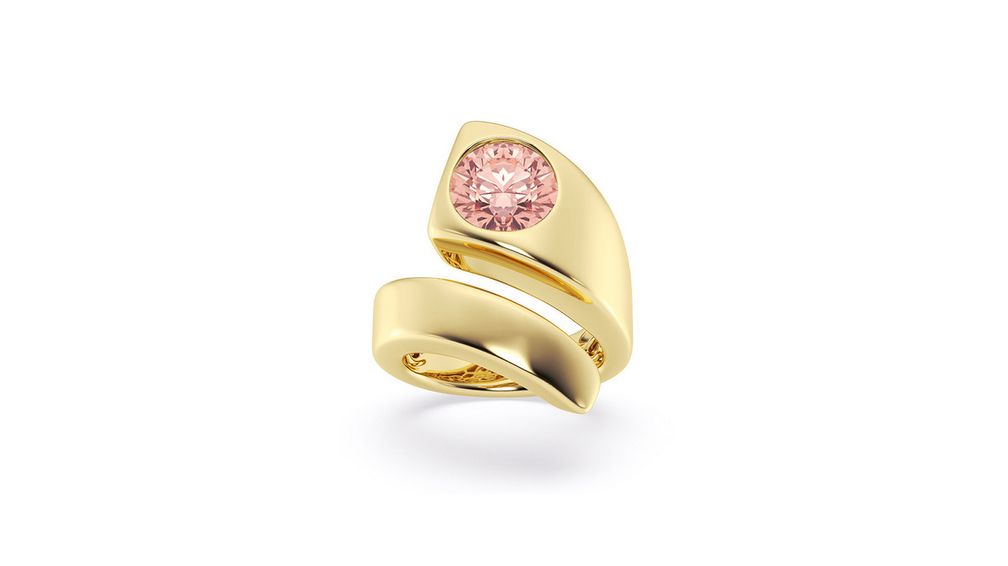 Кольцо Pasadena, которое обвивает палец владелицы, выполнено из 18-каратного желтого золота и украшено 3-каратным круглым розовым лабораторным бриллиантом: