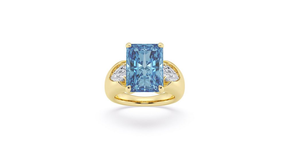 Кольцо Malibu из 18-каратного желтого золота украшено 10-каратным голубым лабораторным бриллиантом огранки радиант и двумя грушевидными белыми лабораторными бриллиантами по бокам общим весом 0,75 карата: