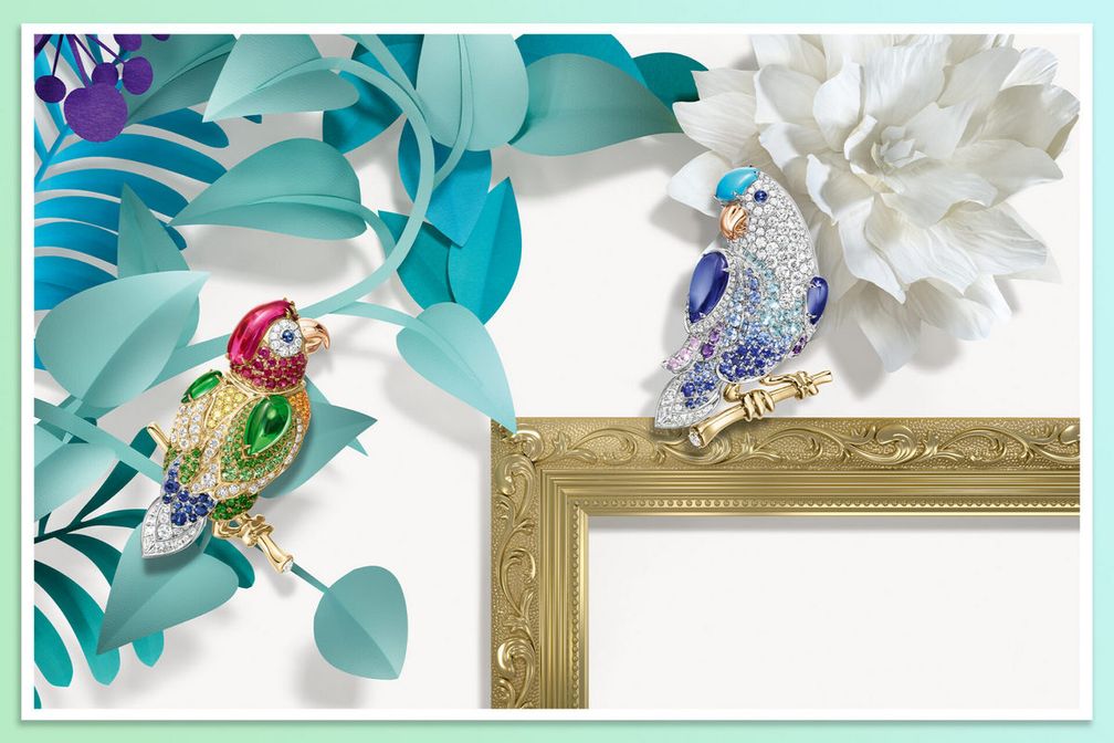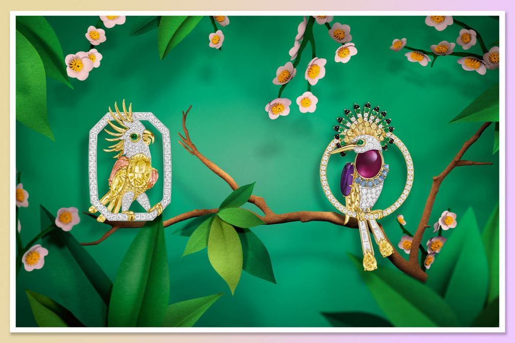 Ослепительные желтые сапфиры и светло-оранжевые топазы огранки кабошон украшают брошь Golden Cockatoo («Золотой какаду») из желтого золота. Точно изображен очаровательный хохолок птицы и передано его живое поведение. Игривый птичий глаз выполнен из изумруда огранки кабошон. Сам какаду помещен в ромбовидную оправу из бриллиантов. Круглые бриллианты и драгоценные камни с теплыми персиковыми оттенками добавляют ему очарования.