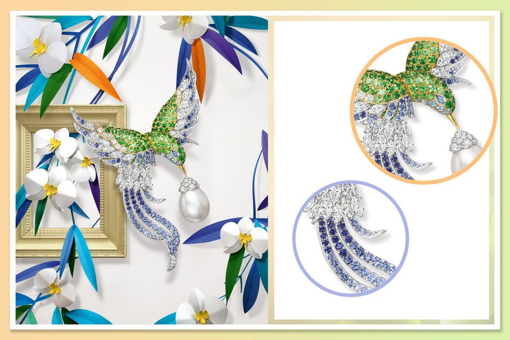 Грациозная колибри запечатлена пьющей нектар, в удивительно реалистичном исполнении с сапфирами, цаворитами, аквамаринами и бриллиантами. Величественные оттенки зеленого и синего, использованные в броши Hummingbird («Колибри»), дополняет блеск бриллиантов. Эта яркая картина оживает благодаря грушевидной жемчужине южного моря, из которой колибри пьет нектар.