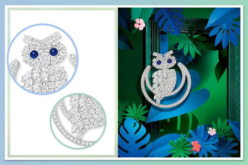 Завершает коллекцию инкрустированная бриллиантами брошь Snowy Owl с глазами из синего сапфира огранки кабошон. Использование бриллиантов в различных огранках для передачи реалистичной формы совы — еще одно проявление мастерства Дома в оправе камней. «Нахмуренные» брови совы, покоящиеся на полумесяце из круглых бриллиантов, украшены бриллиантами багетной огранки. Тело и крылья совы интерпретированы с помощью комбинации бриллиантов огранки маркиза, круглых и грушевидных бриллиантов.