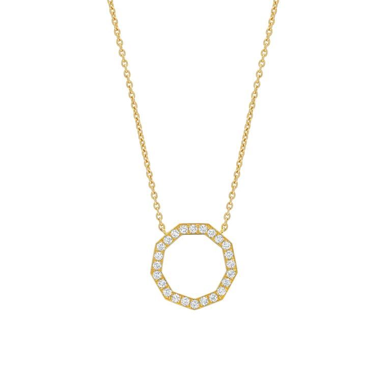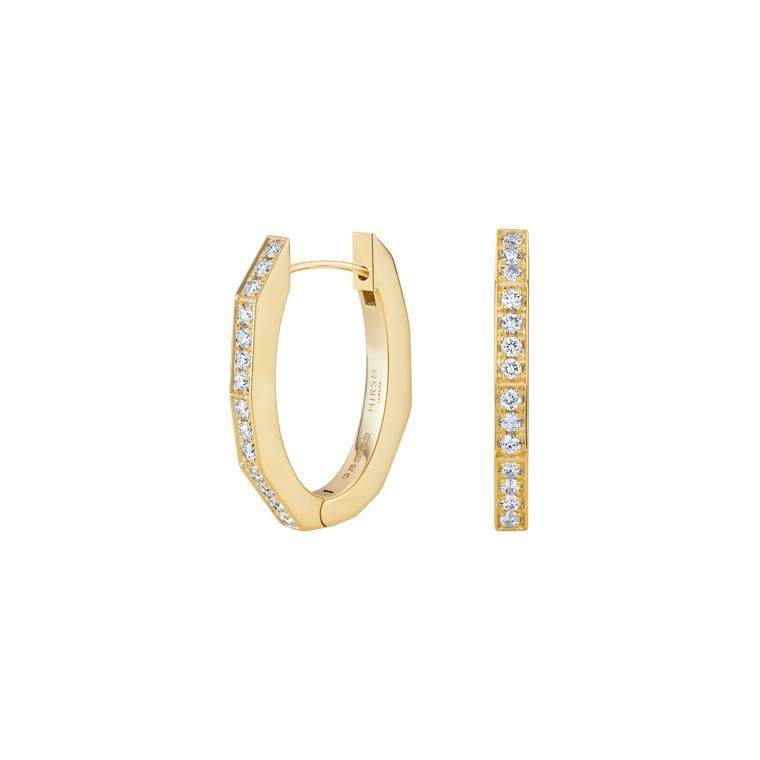 Форма нонагона в украшениях Story от Hirsh London допускает множество вариантов дизайна, в том числе и эти серьги в виде обруча из желтого золота с бриллиантами: