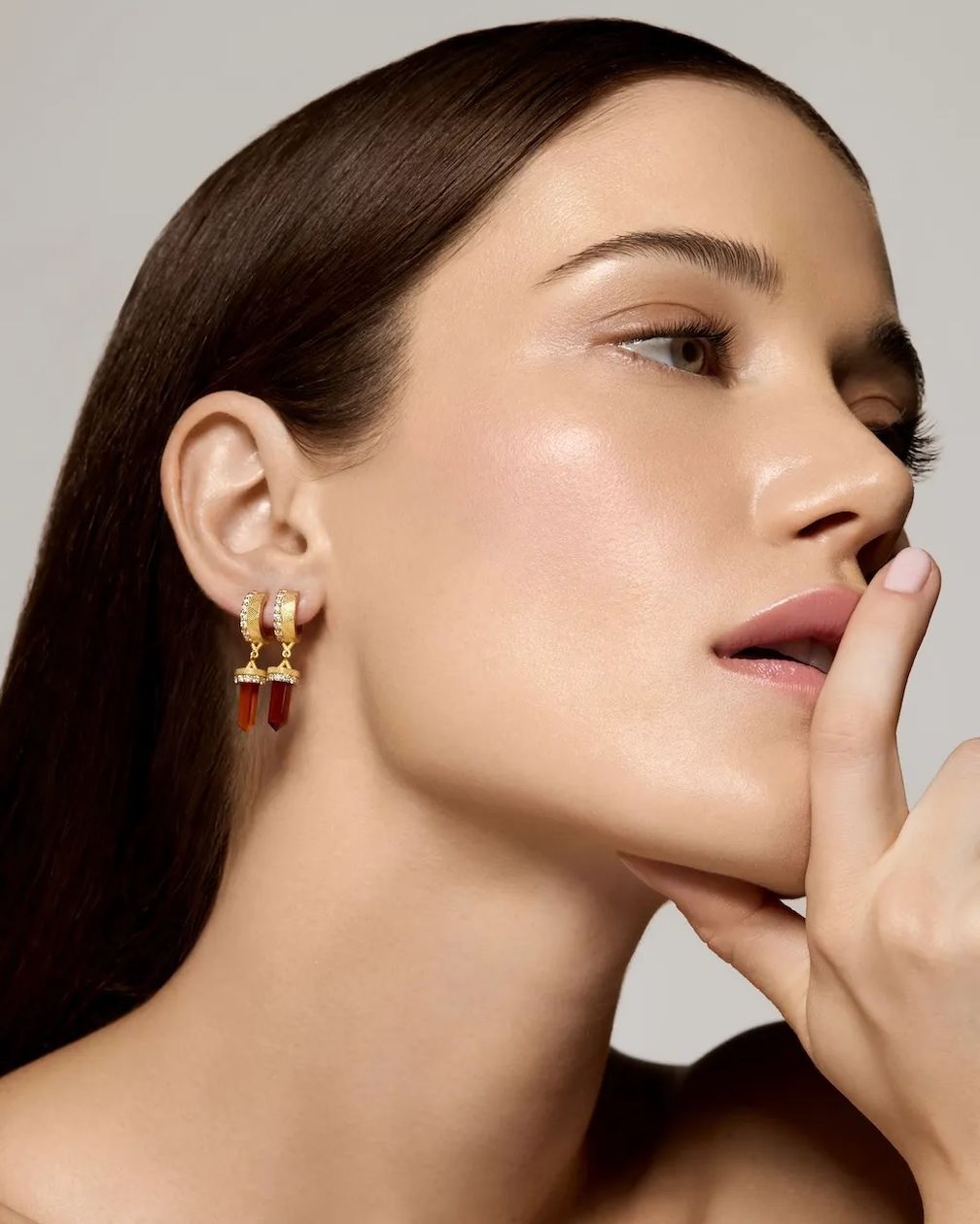 Модель носит серьги-хагги с гранатом, бриллиантами и золотом из коллекции Nova от House of Harlow (любезно предоставлено House of Harlow / фото Beau Nelson):