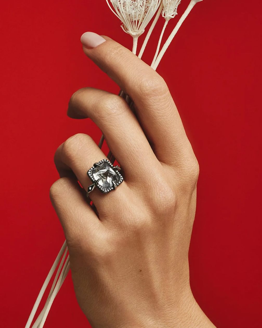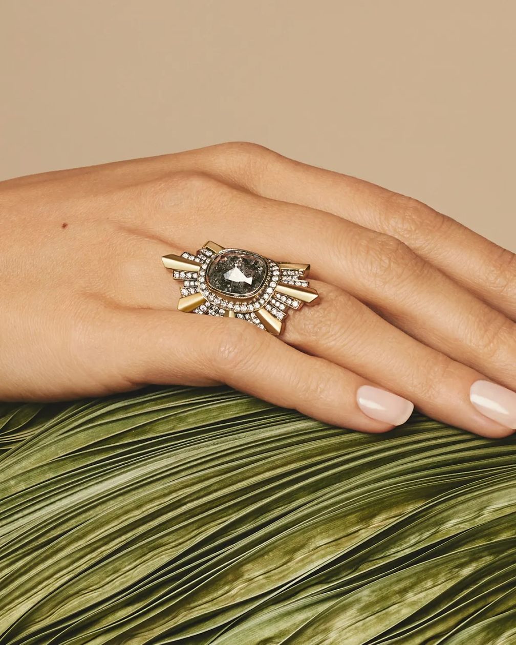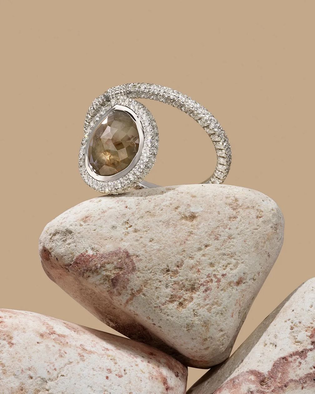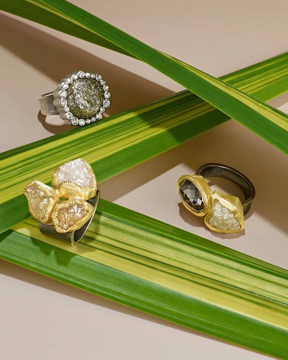 «В необработанном камне есть что-то чувственное», – объясняет Макдональд, которая обрамляет необработанные бриллианты более мелкими ограненными бриллиантами, которые усиливают свет вокруг центрального камня.