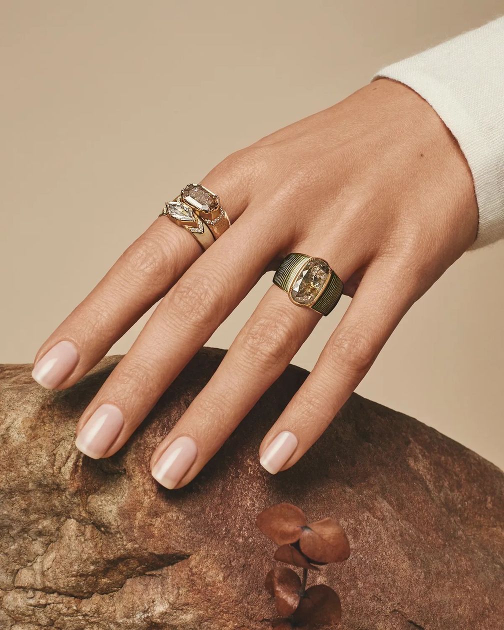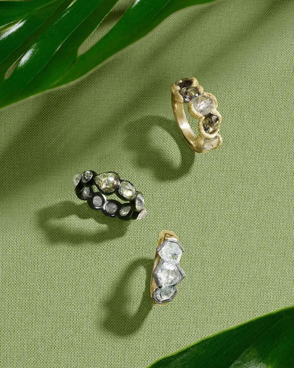 Поскольку эти камни по своей природе индивидуальны по форме и цвету, дизайнеры, такие как Рид, создают каждое кольцо вокруг камня, вручную изготавливая золотые оправы, которые подчеркивают естественные геометрические формы необработанных алмазов.