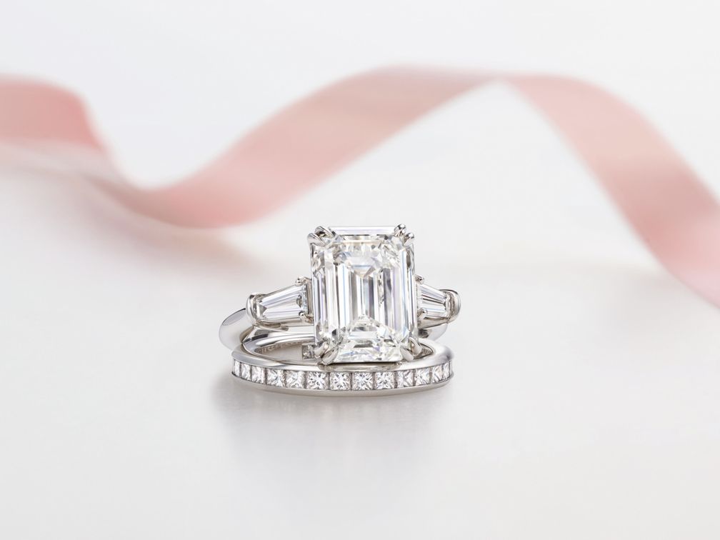 Кольцо Classic Winston с бриллиантом огранки изумруд в сочетании с кольцом с бриллиантами (фото любезно предоставлено Harry Winston):
