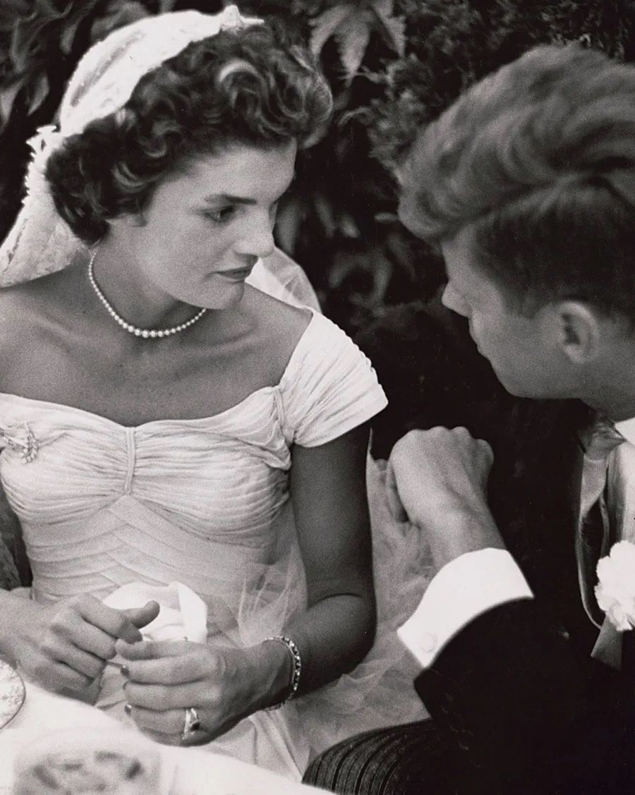 Жаклин Бувье Кеннеди и Джон Кеннеди беседуют на свадебном приеме, Ньюпорт, Род-Айленд (Wikimedia Commons):