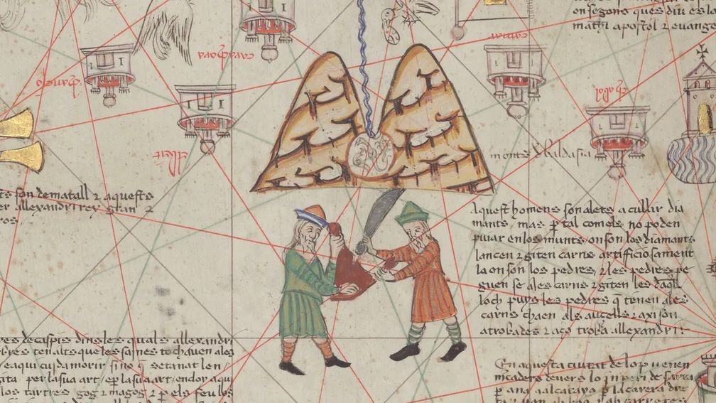 Фрагмент из «Атласа морских карт» Авраама Крескеса, иллюстрирующий «Алмазную долину», около 1370 года (Bibliothèque nationale de France):