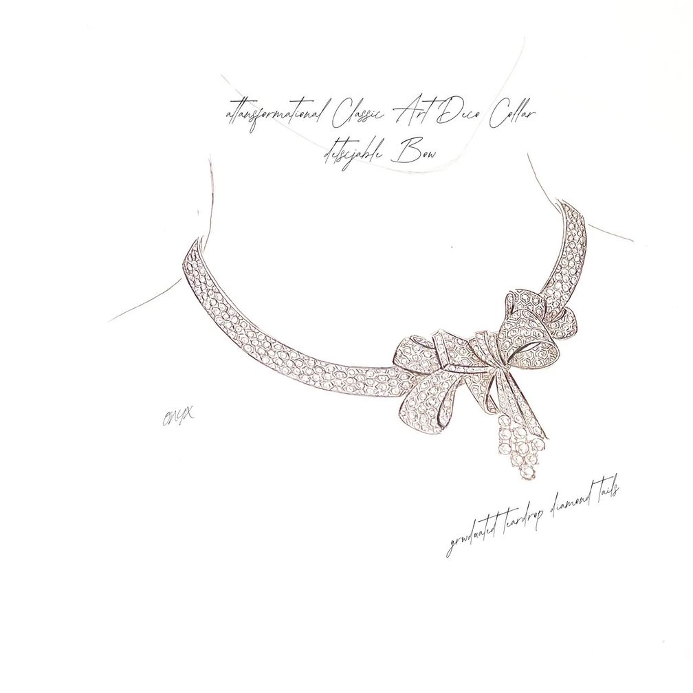 Используя бриллианты, доверенные клиентом Sze & Sons, был разработан классический чокер с ониксом и бриллиантами в стиле ар-деко и трансформирующимся бантом, который можно носить как кулон, как зажим для чокера и как брошь: