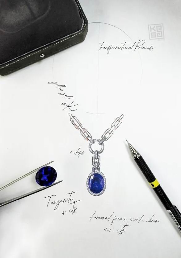 Эскиз с танзанитом, который будет использован в ожерелье Princess от K.S. Sze & Sons. Концептуальным вдохновением послужило использование классической подвески в викторианском стиле, ее модернизация для универсальности и использование более тяжелой, современной цепи: