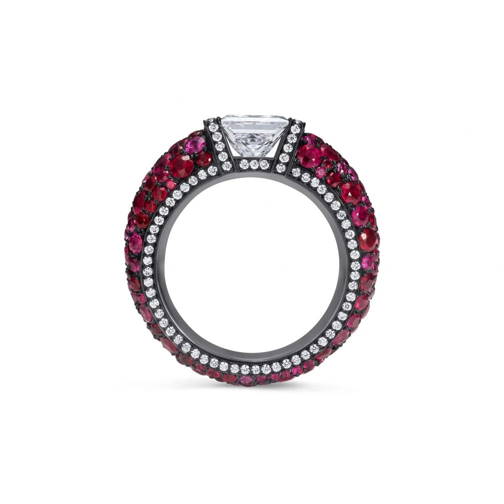 Ничем не примечательное классическое кольцо с солитером, которое имело сентиментальную ценность, Сабина Рёмер превращает в уникальное, но сдержанное изделие. Чтобы добиться этого, она удалила оригинальный камень, расплавила металл, чтобы создать новую форму, и переосмыслила кольцо с помощью оправы neige pavé, сочетающей оттенки рубинов и белых бриллиантов: