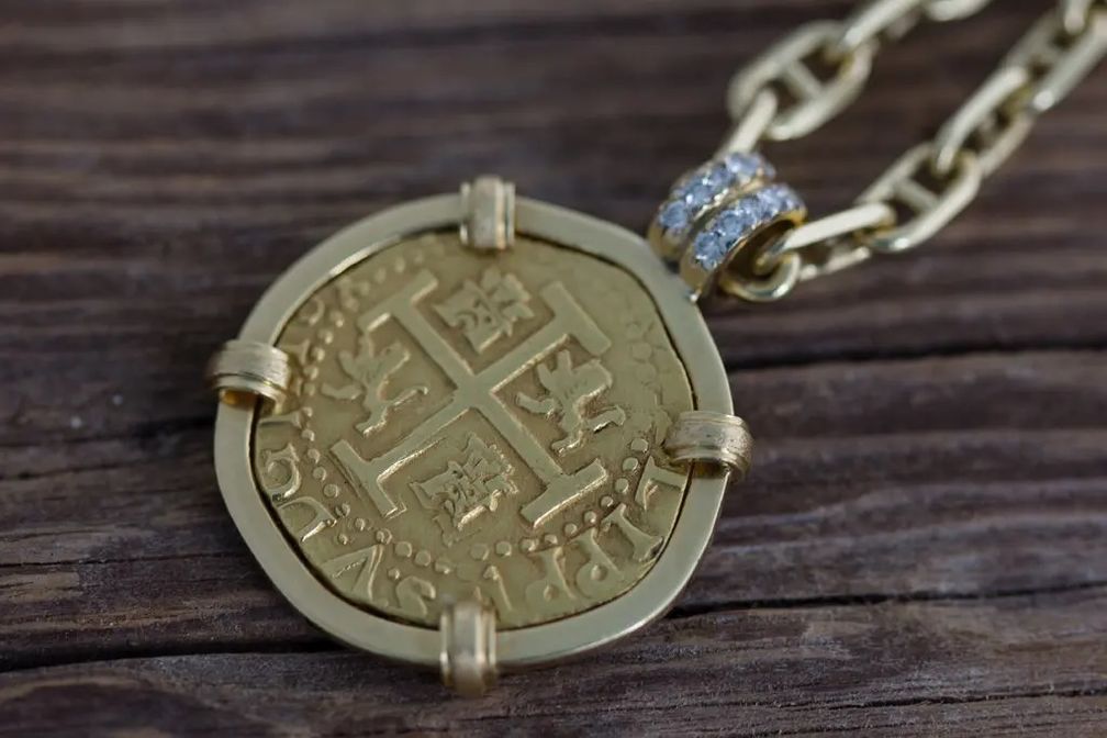 Компания Mel Fisher’s Treasures, основанная охотником за сокровищами, превращает часть своей добычи в ювелирные изделия, как, например, эта монета, найденная у восточного побережья Флориды после кораблекрушения в 1715 году: