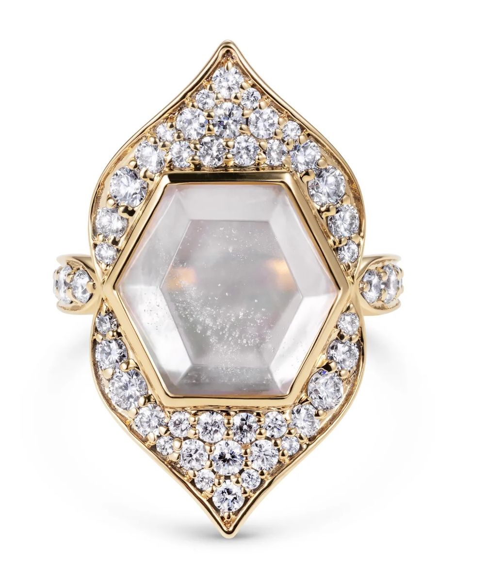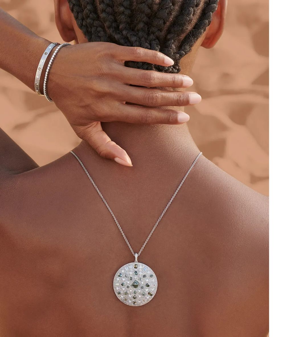 По ее словам, энергия бриллианта усиливает энергию других кристаллов и умножает их целебные свойства. Это одна из причин, по которой почти все ее изделия украшены бриллиантами. Среди ее выразительных мотивов – Sri Yantra, на которой изображен геометрический узор из бриллиантов, используемый в медитации для уравновешивания и концентрации ума.