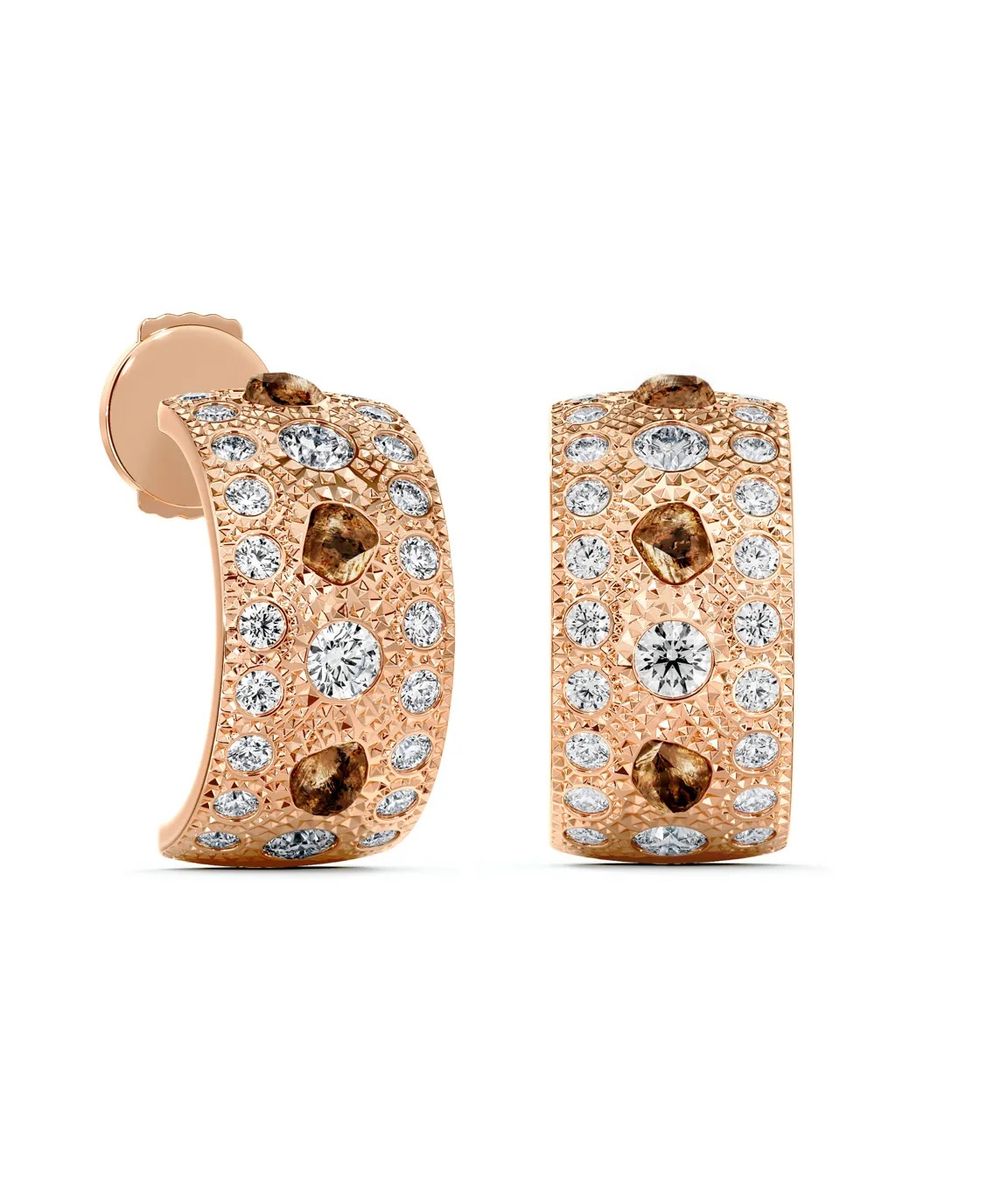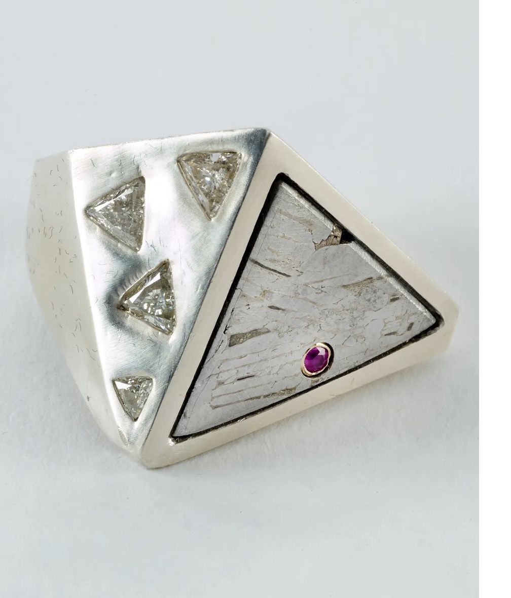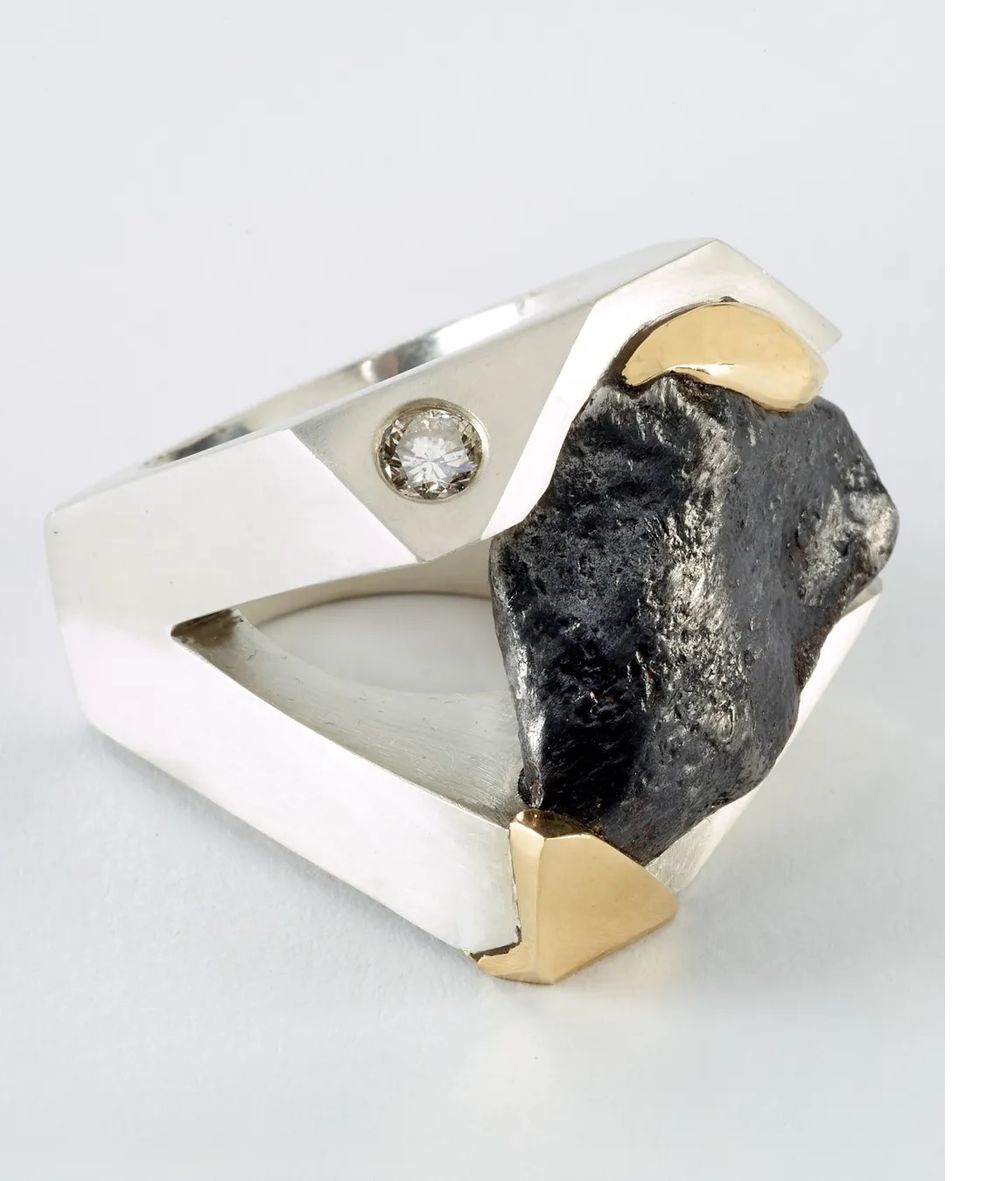 Это выражается в таких изделиях, как кольцо Callisto с метеоритом в оправе из 19-каратного розового золота с бриллиантами цвета шампань. Сочетая в себе элементы земли, его изделия выглядят как естественные скальные образования.