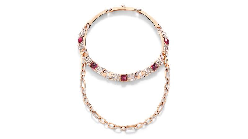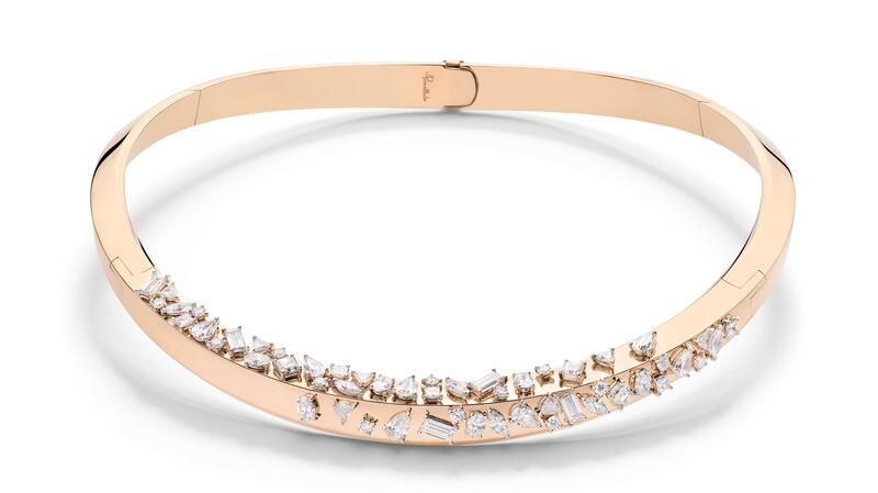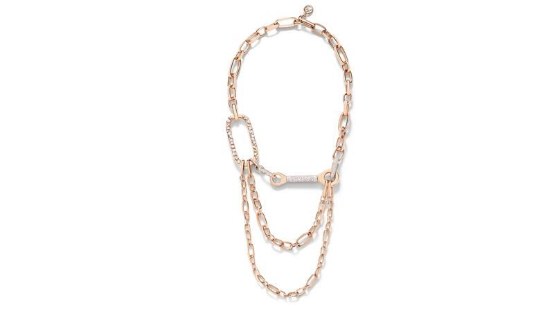 Колье Castello – это то, что Pomellato называет “нео-средневековым”, с “плитками” из розового золота, соединенными звеньями и инкрустированными бриллиантами.