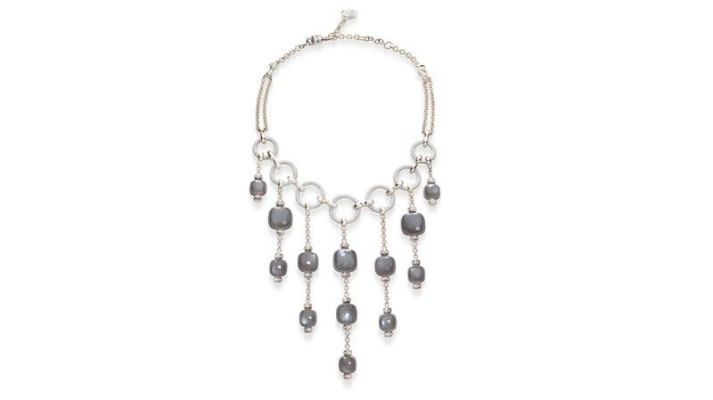 Компания Pomellato также переосмыслила свою классическую коллекцию Nudo, создав колье Nudo Cascade с каплями серого лунного камня, спускающимися с замысловатой графичной цепочки.