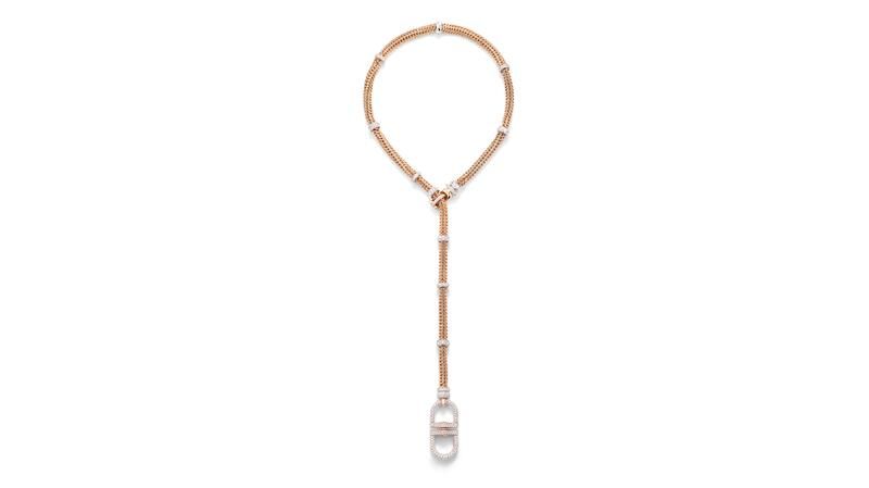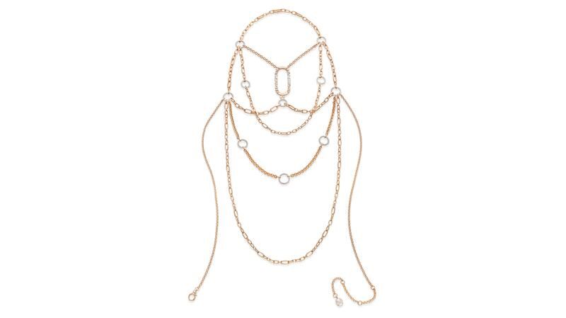 Колье-цепочка для тела Sipario сочетает в себе стили цепочек и различную огранку бриллиантов, чтобы драпировать торс, а цепочка-лариат Catena Milano из розового золота предлагает несколько вариантов ношения.