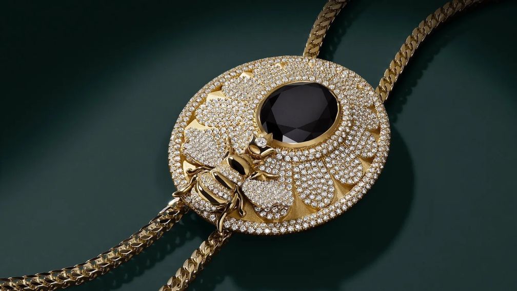Единственное в своем роде украшение знаменито пчелой из переработанного 18-каратного желтого золота, с природным черным бриллиантом весом 14,46 карата, окруженным 1 046 бриллиантами pavé общим весом 5,7 карата.