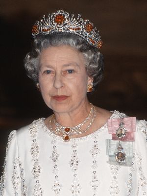 Одно из самых известных ювелирных изделий королевы Великобритании – рубиновая тиара. Интересным фактом является то, что раньше камни украшали другой аксессуар, но затем его изменили и придали совершенно другие формы. Такой щедрый подарок Елизавета II получила на свадьбу.