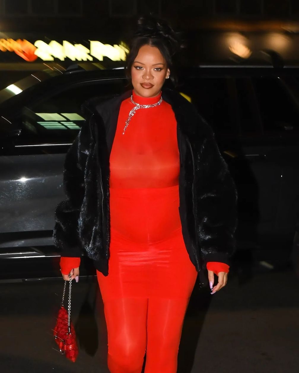 Рианна была замечена в многослойных бриллиантовых ожерельях от Briony Raymond 28 декабря 2024 года в Нью-Йорке (Getty Images):