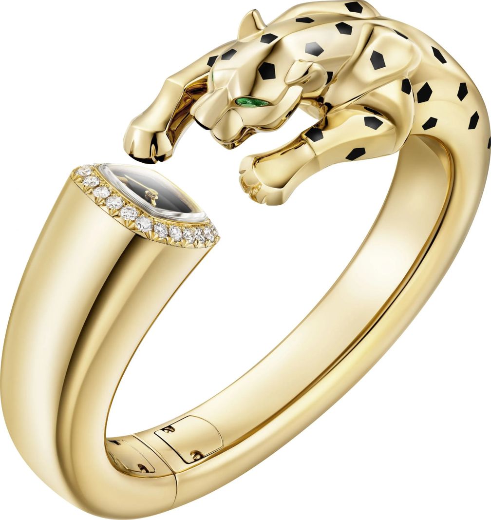 Ювелирные часы Panthère из желтого золота и черного лака, украшенные 23 бриллиантами бриллиантовой огранки (общим весом 0,78 карата) и двумя грушевидными гранатами-цаворитами:
