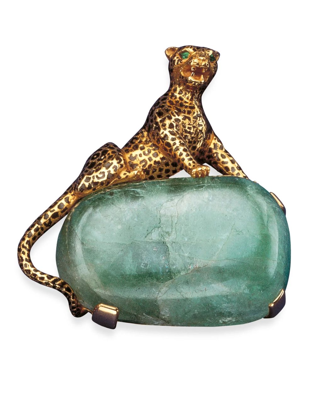 Скульптурная и властная, в некоторых случаях она смело охватывает циферблат. Выполненная в трех измерениях – с четко очерченным носом, пронзительными зелеными глазами и заостренными ушками – ее золотистая головка часто украшается культовым черным лаковым покрытием Cartier, что оживляет украшенное драгоценностями создание.