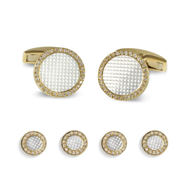 Эти запонки в стиле ар-деко сдержанны, но достаточно красивы, чтобы добавить ярких красок и элегантности однотонному костюму. Старинные запонки из 18-каратного желтого золота в круглой оправе с бриллиантовой каймой, представленные на сайте Deakin & Francis: