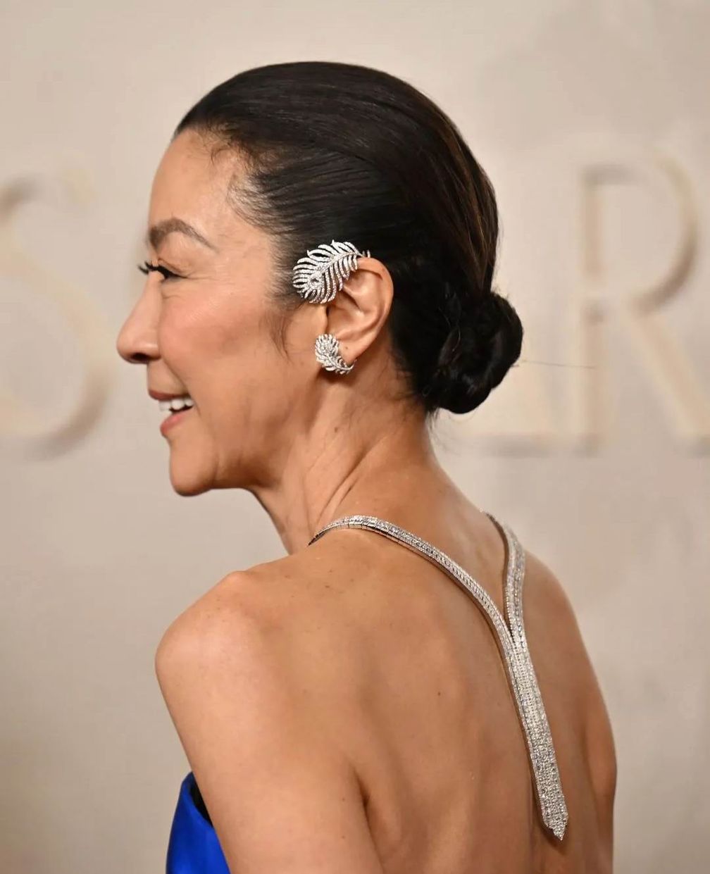 Мишель Йео надела асимметричные серьги Boucheron Plume de Paon на церемонии вручения премии «Оскар» 02 марта 2025 года (Getty Images):