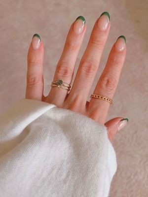 Френч – это красивый и неповторимый дизайн, который подходит всем без исключения. Лаконичный салатовый оттенок во френче не будет столь акцентным и ярким, так как самого лака будет немного, если очерчивается только улыбка. Для дополнительного перекликания с аксессуарами нанесите тонкую полоску серебряного лака или блесток, чтобы провести параллель с серебряными украшениями на пальцах. Кольца могут быть как небольшими и аккуратными, так и фантазийными. Инкрустацию камня также можно удачно обыграть. Например, если минерал прозрачный, то глиттер или тот же серебристый лак будет связующим звеном.