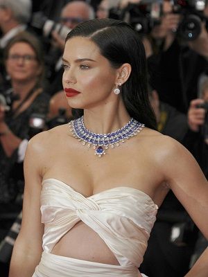 Для посещения кинофестиваля на Лазурном берегу в 2018 году к белоснежному корсетному платью Адриана выбрала роскошное колье из белого золота с множеством небольших танзанитов и одним большим в центре в круглой огранке. В ушах ее эффектно смотрелись аккуратные серьги с бриллиантами на белом золоте.