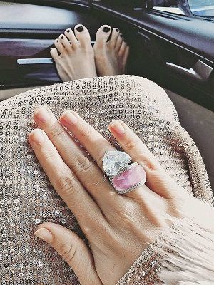 Знаменитость любит показывать свое сокровище – кольцо из белого золота с редким минералом необычного голубого оттенка. Этот камень называется Турмалин Параиба: он считается самым дорогим драгоценным камнем в мире.