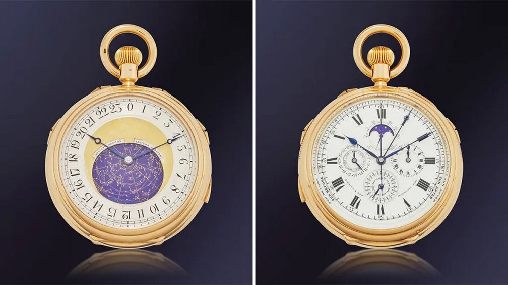 Эти ультраредкие часы значительно превзошли свою максимальную оценочную стоимость в 1 миллион долларов, и легко понять почему. «Grosse Pièce», или № 16869, — это самые полные астрономические часы, когда-либо созданные швейцарским часовым производителем. Выполненные из 18-каратного желтого золота, эти невероятные часы отображают ночное небо Лондона с 315 звездами и 18 созвездиями — единственные часы марки с такой небесной картой, по данным отдела наследия Audemars Piguet. Эта необычная функция сочетается с отображением звездного времени, вечным календарем, фазами Луны и отображением уравнения времени, а также минутным репетиром, функциями большого и малого боя, хронографом и единственным в своем роде турбийоном в карманных часах той эпохи.