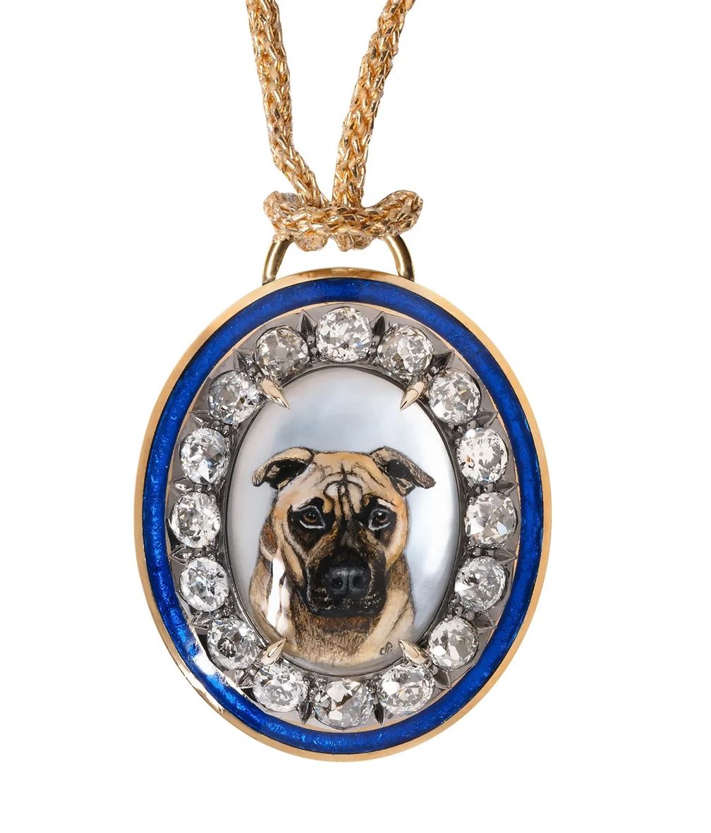 Портрет собаки, нарисованный вручную на эссекском хрустале в окружении бриллиантов и голубой эмали, от Millie and Noah: