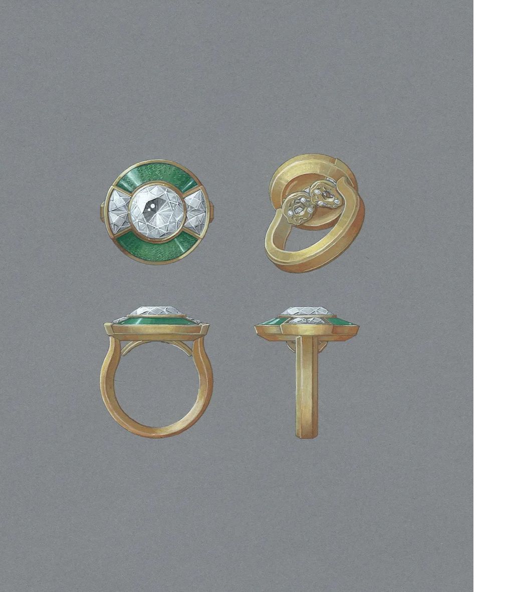 Один из недавних клиентов, увлекающийся искусством, представлял себе кольцо с современным бриллиантом, а в итоге получил бриллиант старинной европейской огранки, окруженный россыпью бриллиантов в насыщенном зеленом гильошированном эмалевом узоре.