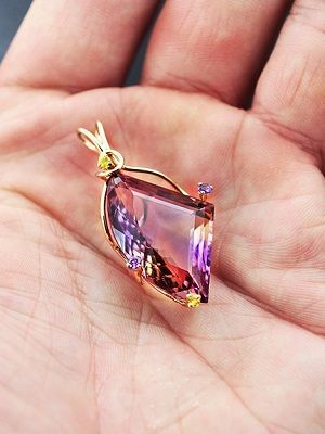 Аметрин – невероятной красоты самоцвет, который широко используется в ювелирном деле. Драгоценный кристалл встречается в разных украшениях, в том числе, на подвесках и колье. Аксессуары привлекают внимание разнообразным дизайном, необычной цветовой гаммой и невероятным сиянием.