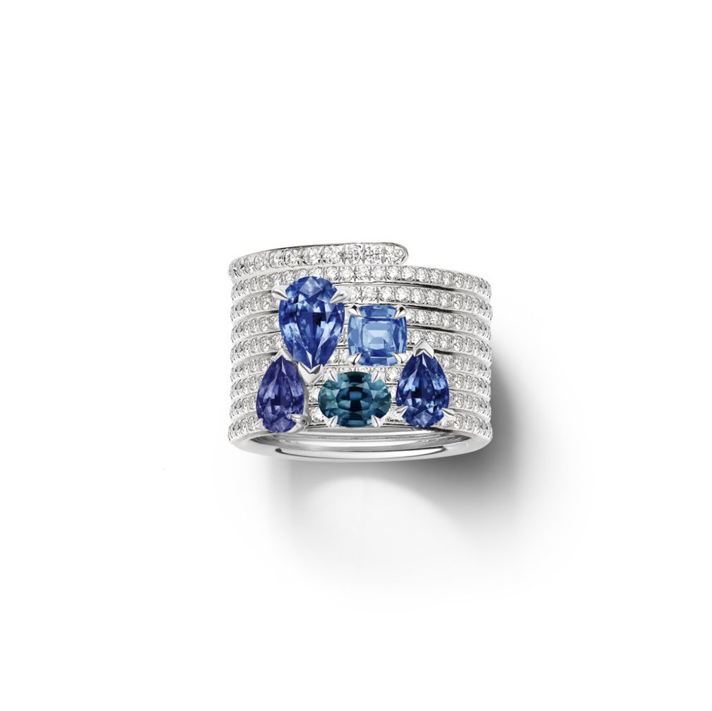 - Кольцо Blast (белое золото), инкрустированное бриллиантами и украшенное сапфирами, индиколитами и танзанитами.