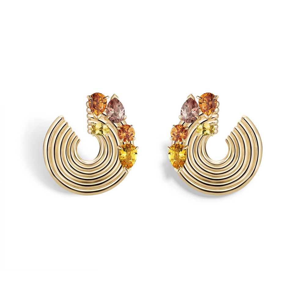 - Серьги-кольца Blast Spiral (розовое золото) со спессартинами, персиковыми турмалинами и цитринами, создающими сияющее тепло.