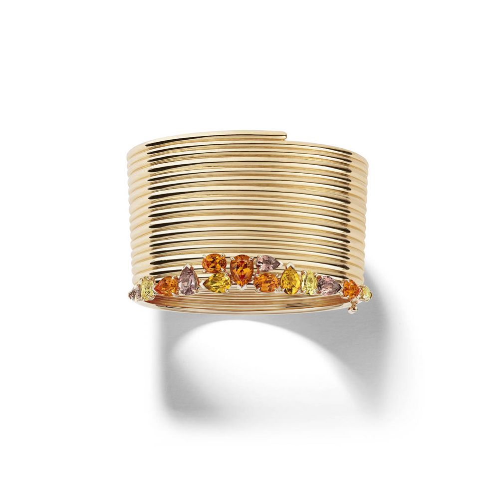 - Браслет-кафф Blast (розовое золото) — роскошный свиток из цветных драгоценных камней, сочетающий элегантность и безудержную энергию.