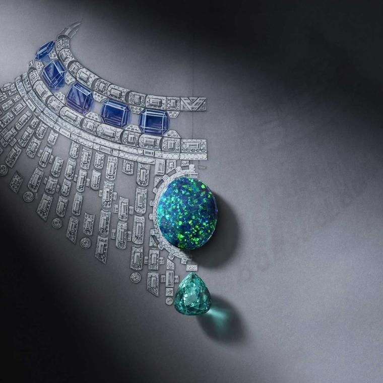 Самым сложным украшением, когда-либо созданным Louis Vuitton, является колье Bones (вверху). Украшение из бриллиантов огранки багет имитирует человеческий скелет, образуя шарнирную бахрому, которая движется вокруг светящегося австралийского опала весом 43,58 карата, турмалина параиба весом 20,93 карата и танзанитов весом почти 92 карата.